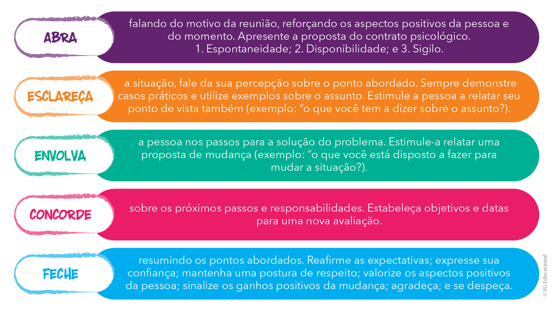 Considerando esse contexto, elaboramos um processo composto por cinco etapas, que tem a finalidade de instruir os gestores sobre como proceder no momento de aplicação do feedback. É importante mencionar que é imprescindível um planejamento prévio sobre os assuntos que serão abordados, bem como o levantamento de fatos e dados para compor a argumentação no momento da aplicação.